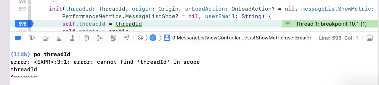 개인 프로젝트를 진행하면서 GoogleAPIClientForREST 라이브러리를 추가한 뒤부터 Xcode의 디버거가 동작하지 않는 문제가 발생했습니다. 중간에 브레이크를 걸고 'po 객체'를 하면 아래 사진과 같이 해당 객체를 찾을 수 없다며 디버거가 동작하지 않습니다(한동안 원인도 모르고 끙끙 앓면서 print로 디버깅을 했음... ㅠㅠ).